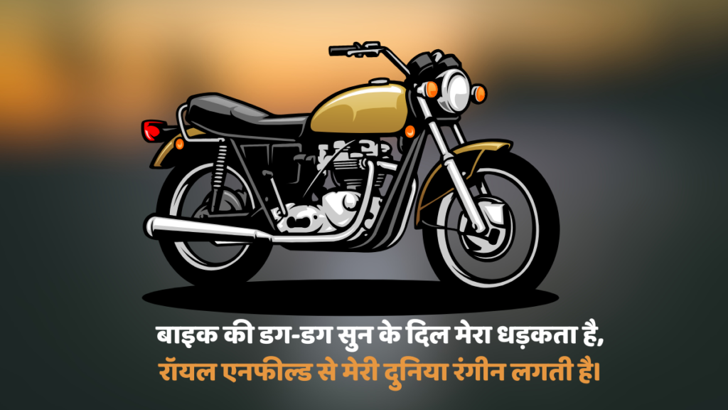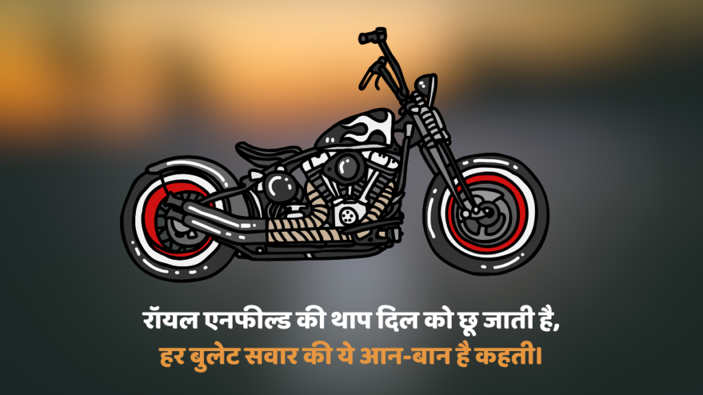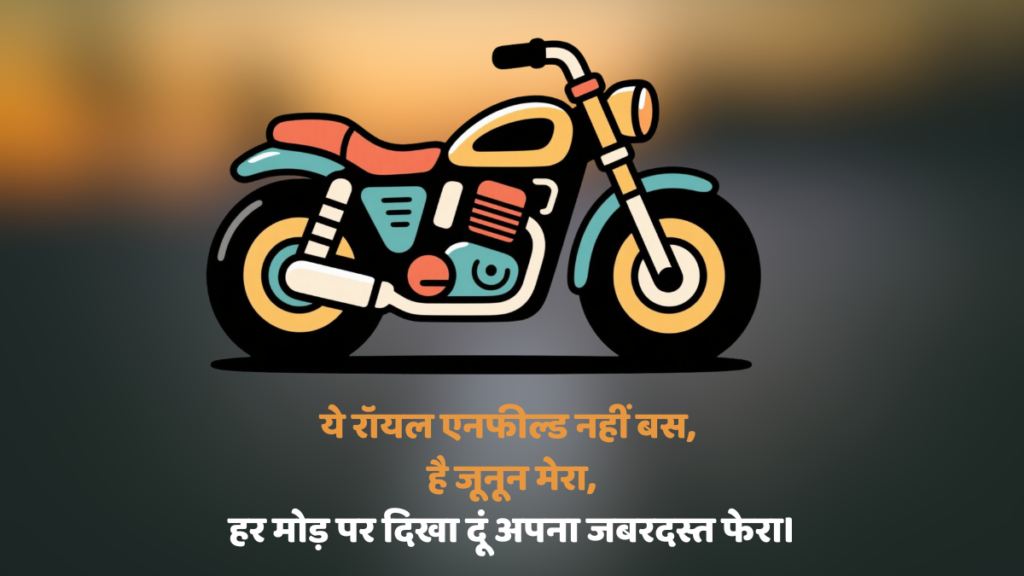 Royal Enfield Shayari की शान में लिखी गई ये शायरी हर बुलेट सवार के दिल में जोश और जुनून की आग भर देती है। इसकी हर पंक्ति में बाइक के प्रति गहरा प्यार और स्वैग झलकता है। अगर आप भी रॉयल एनफील्ड के दीवाने हैं, तो यह Shayari आपके दिल को छू जाएगी। इसे पढ़ें, महसूस करें और अपने बोलती वाली बाइक के इश्क को दुनिया के साथ साझा करें।
