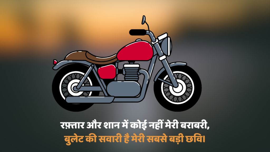 यह शायरी उन जज़्बातों का आईना है, जो बुलेट सवारों के दिलों में बसे होते हैं। इन शायरियों में बाइक की रफ्तार के साथ-साथ स्वैग और जुनून की गहराई भी झलकती है। हर पंक्ति बुलेट की धड़कन की तरह जोरदार और दिल को छू जाने वाली होती है। यह शायरी बाइकर्स की उस भावनात्मक यात्रा को बयां करती है, जो सिर्फ राइडिंग नहीं, बल्कि एक पहचान है।